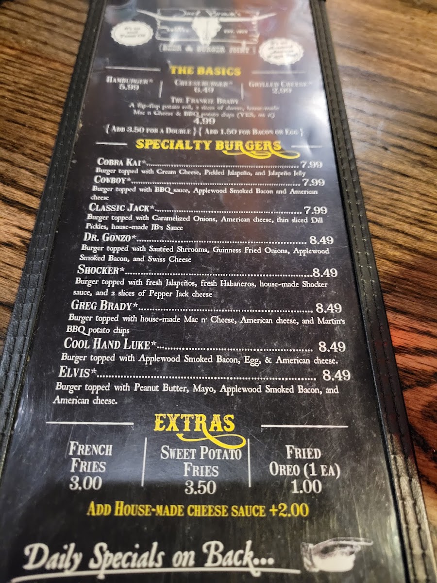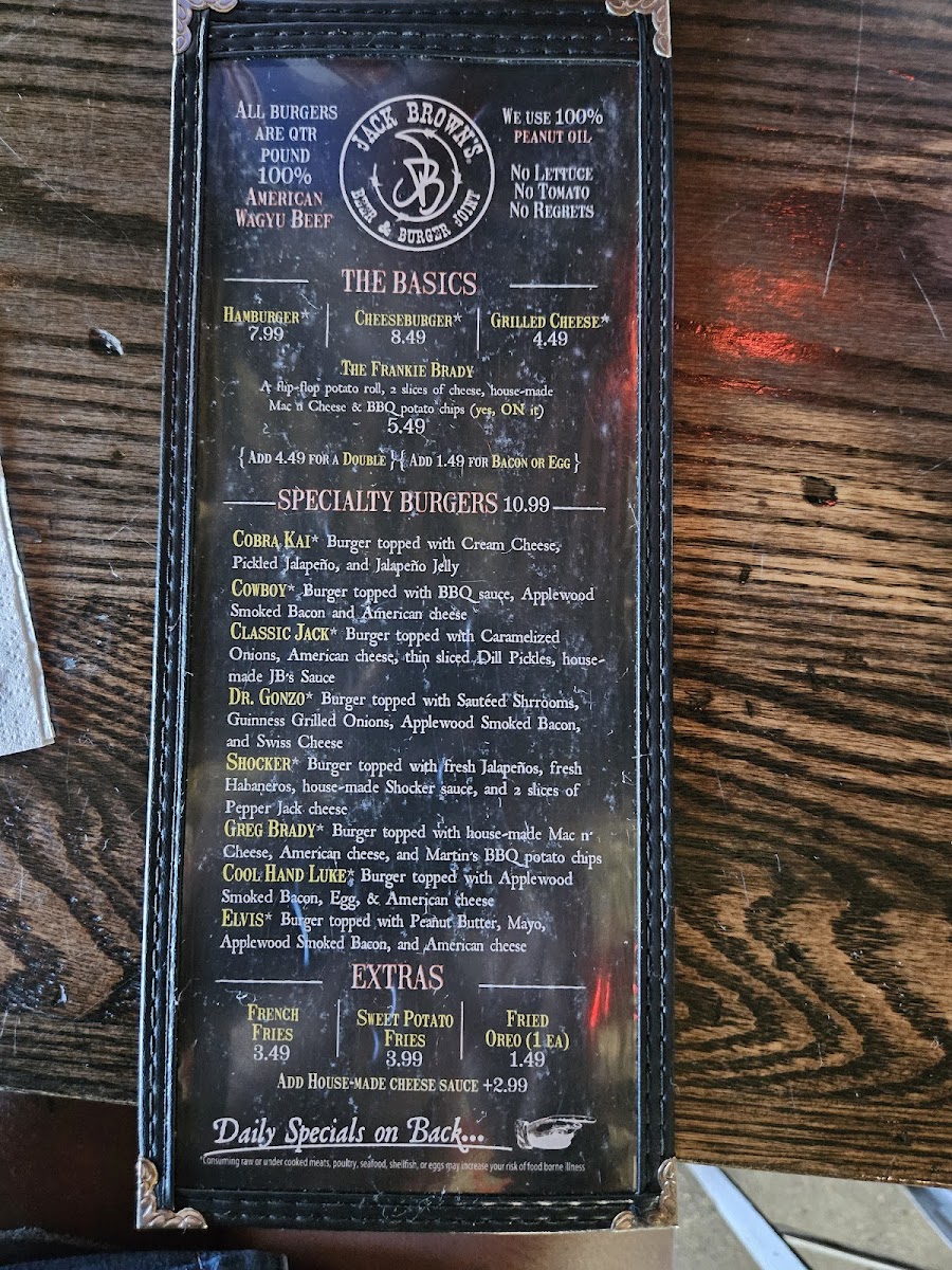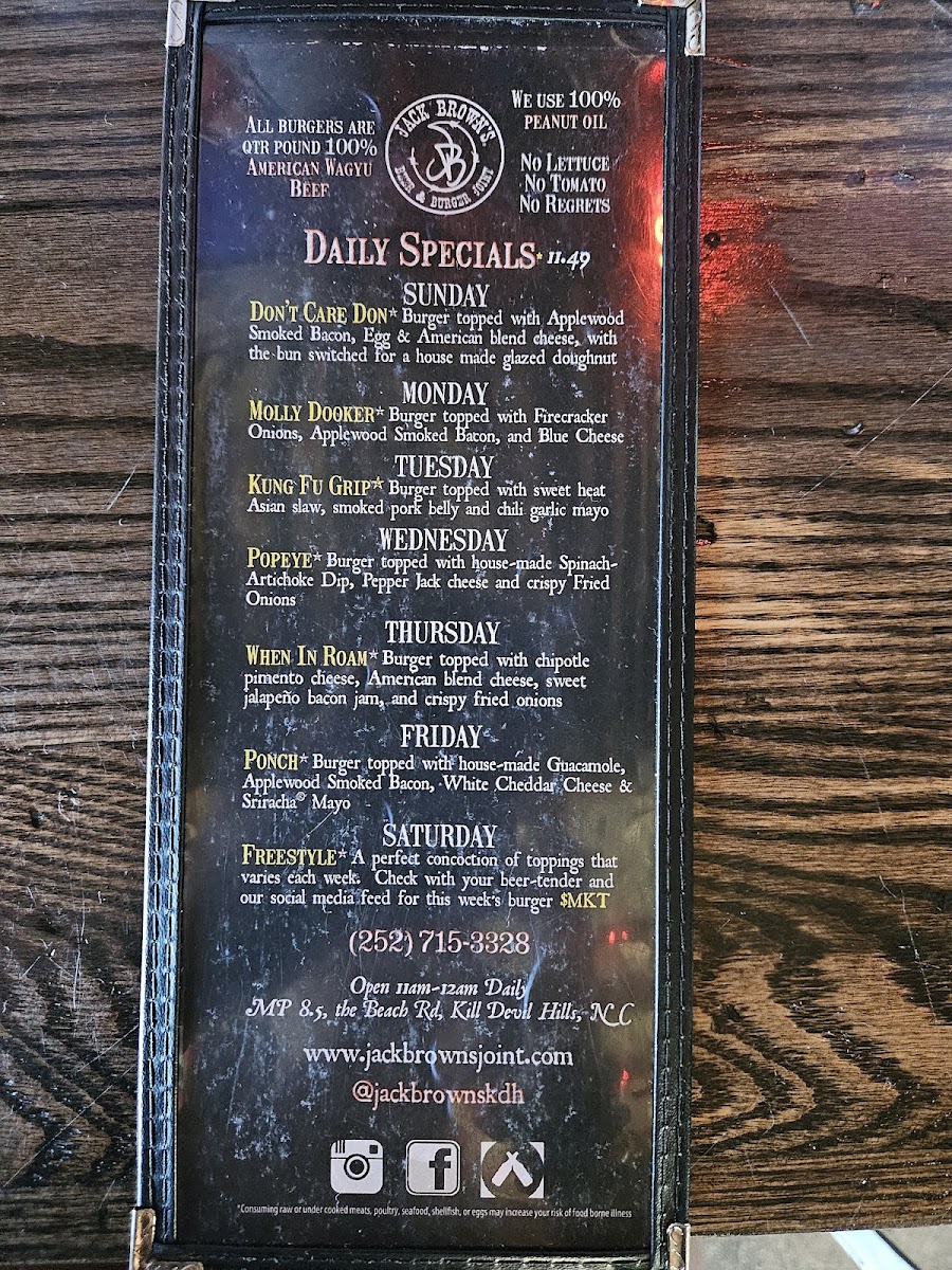 Welcome to Jack Brown’s Beer & Burger Joint in Kill Devil Hills, where a vibrant atmosphere meets mouthwatering menu offerings. The heart of the menu features gourmet burgers crafted from premium Wagyu beef, like the classic Cheeseburger ($9.49) topped with American Cheddar, or the unique Cobra Kai Burger ($11.99) dancing with cream cheese and pickled jalapeños. Indulge in the nostalgic Frankie Brady grilled cheese ($4.99), complete with housemade mac and cheese.